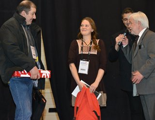 Cette année, c’est Sophie Wintzer, jeune charpentière de 24 ans, en formation dans le CFA de St Pierre des Corps et apprentie dans l’entreprise « Au bois Couvert » qui a gagné le Trophée Or de l’apprenti. © Jean-Luc Abraïni