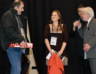 Sophie Wintzer remporte le Trophée d’Or de l’Apprenti avec son maître d’apprentissage Xavier Marché. Ils ont reçu leurs prix des mains de Marcel Malmartel, secrétaire général du CCCA-BTP (à droite).